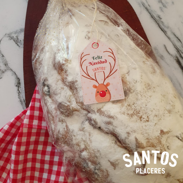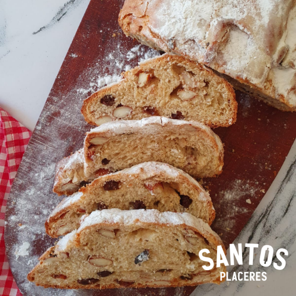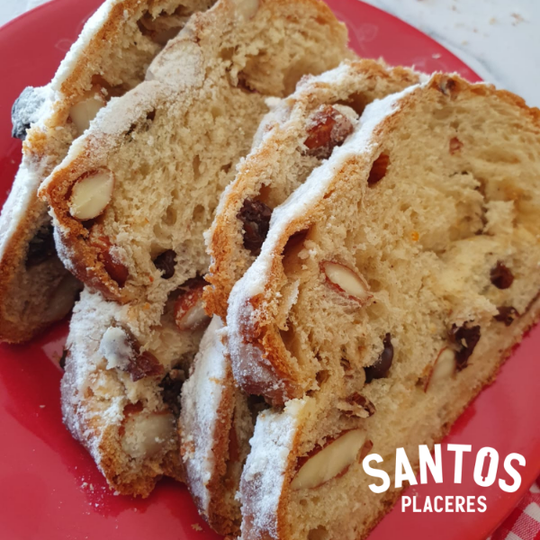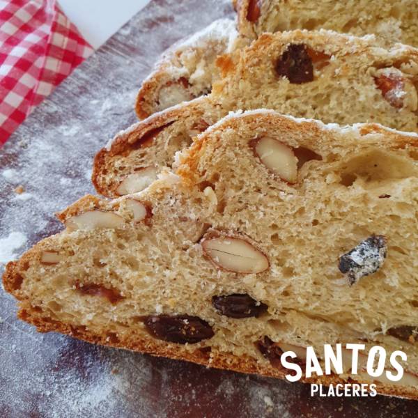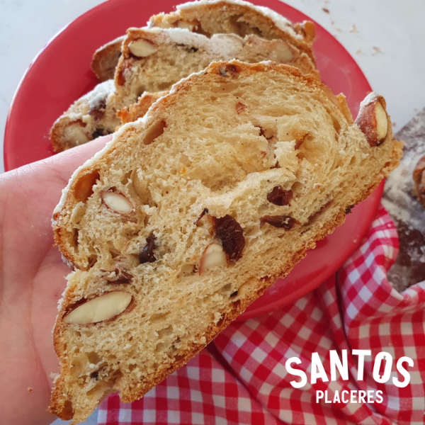 Miga tierna y perfumada, con almendras tostadas que aportan crocante y pasas maceradas en licor, que le dan ese toque jugoso y festivo.